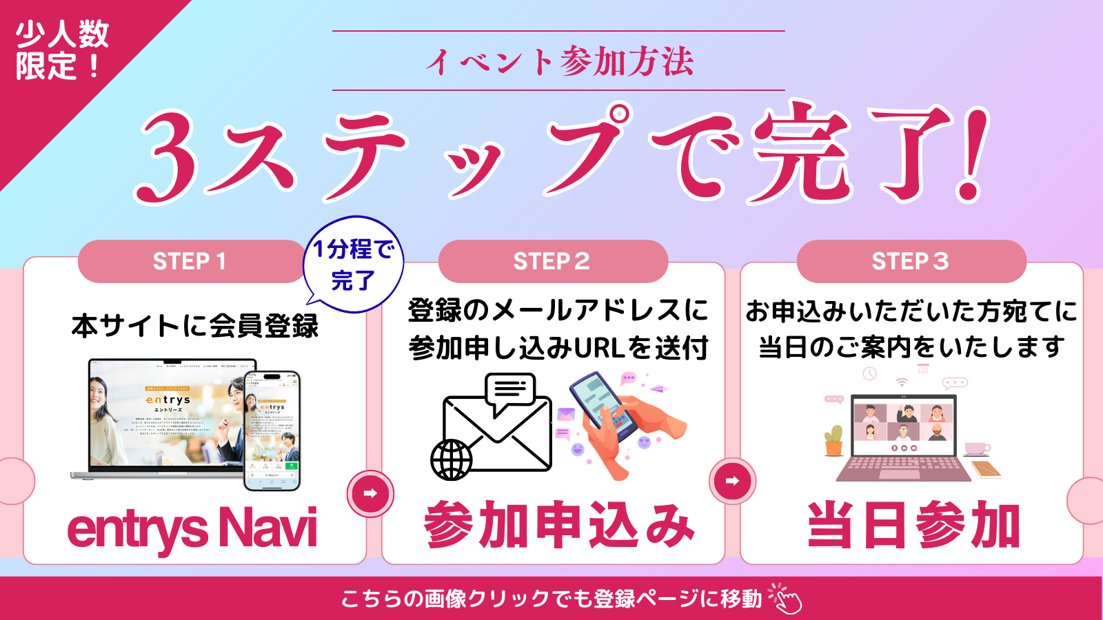 こちらのサイトに登録をいただき、その後にご登録いただいたメールアドレス宛にイベントに関するご案内をいたします。(登録1分ほどで完了!)