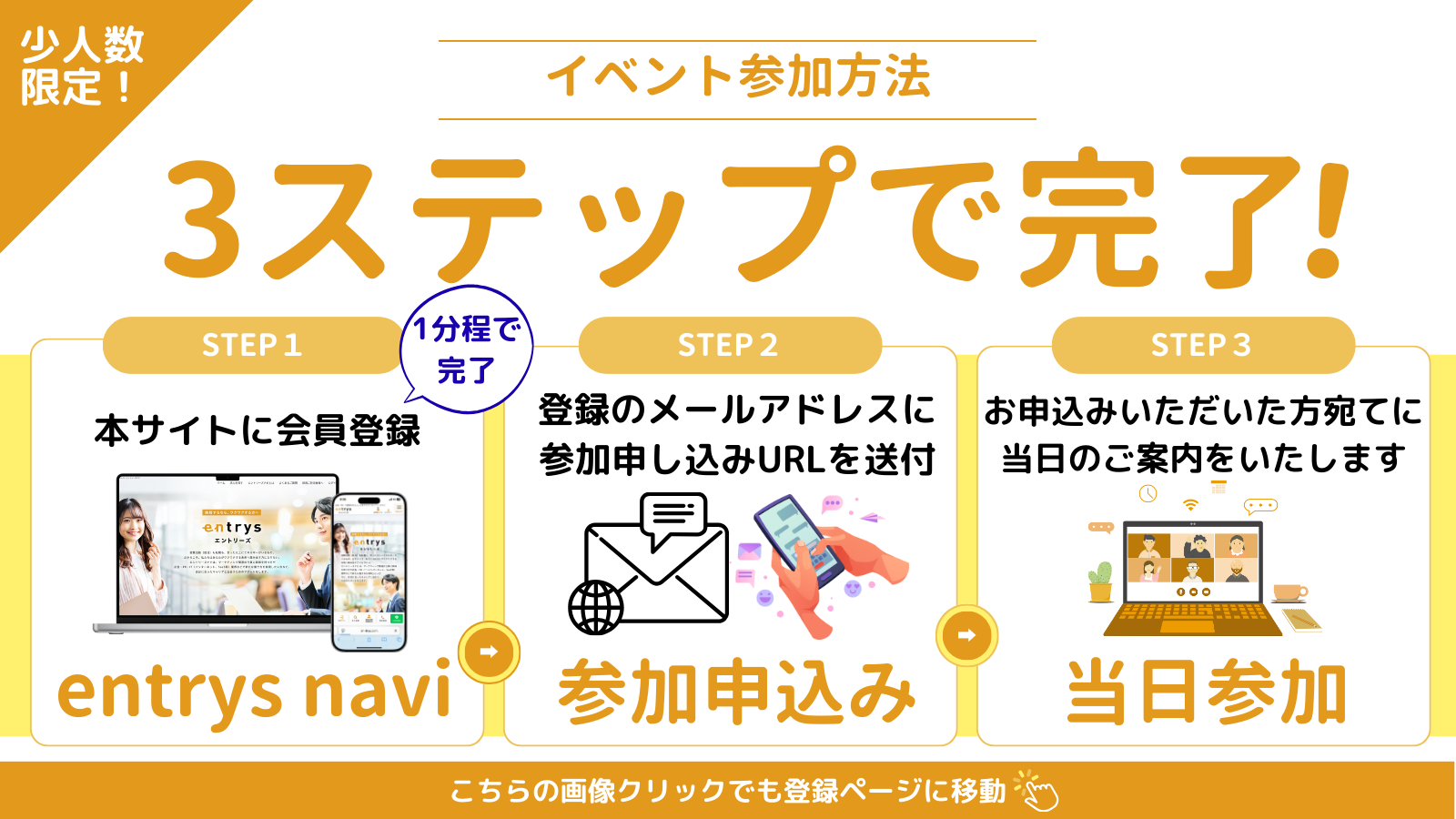 こちらのサイトに登録をいただき、その後にご登録いただいたメールアドレス宛にイベントに関するご案内をいたします。(登録1分ほどで完了!)